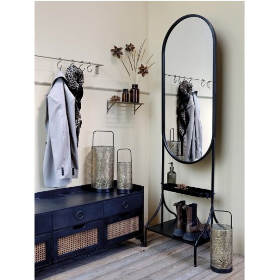 Elevate your space with this modern floor-standing mirror, thoughtfully designed with built-in shelves for added functionality. Featuring a sleek, oval mirror framed in sturdy black metal, this piece blends contemporary style with practical storage solutions.